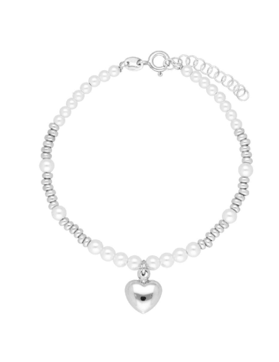 Pulsera Liska plata de ley con baño de rodio, perlas y corazón para mujer.