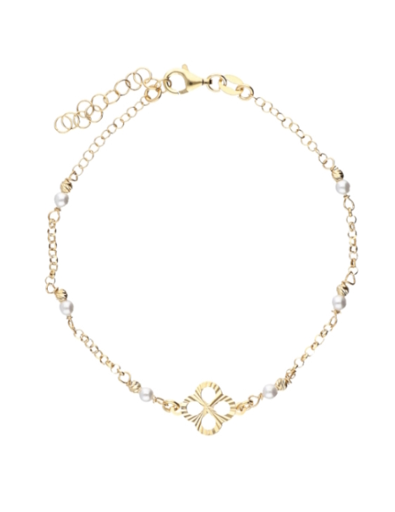Pulsera Liska plata de ley con baño de oro, trébol y perlas para mujer.