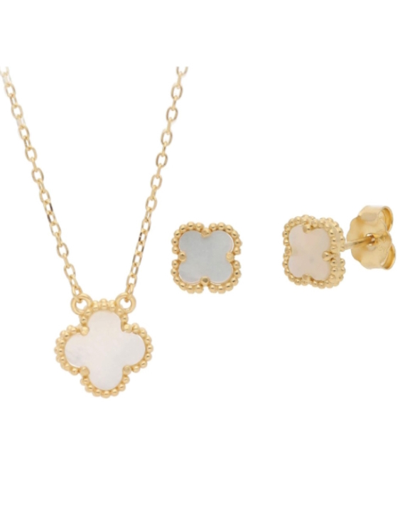 Collar y pendientes Liska plata de ley con baño de oro y tréboles con nácar para mujer.