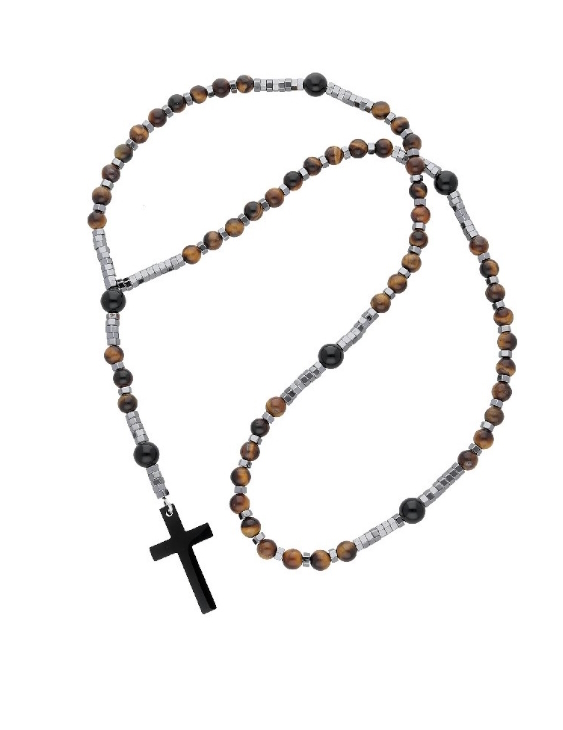 Collar Rosario Liska acero y ojo de tigre para hombre.