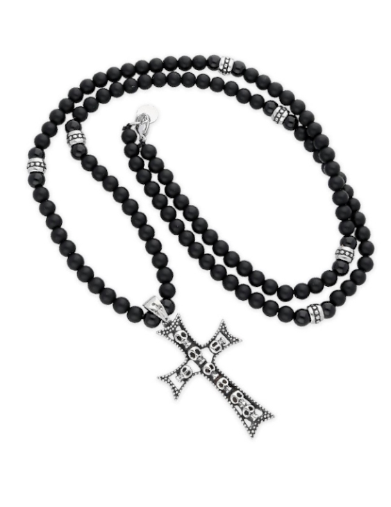 Collar Liska ónix con cruz de acero y calaveras para hombre.